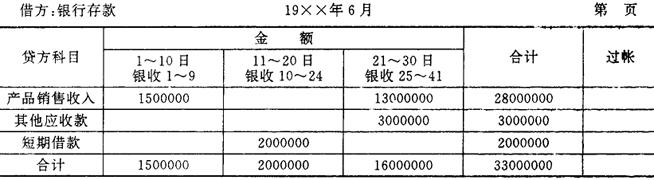 汇总记帐凭证是一种累计汇总的记帐凭证,是登记总帐的依据。汇总记帐凭证按总帐科目的贷方(或借方)设置,并按对应的借方(或贷方)总帐科目归类整理填制。一般设置有汇总收款凭证、汇总付款凭证、汇总转帐凭证。汇总收款凭证分别按现金、银行存款等货币资金借方设置,并按对应的贷方科目定期归类汇总。其格式如图表1-5-3(以银行存款为例)。 图表1-5-3 汇总收款凭证