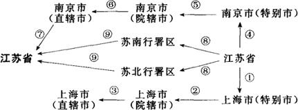 ①1912年称江苏省;1921年从江苏省上海县划出一部分设上海特别市。②1930年上海市改为院辖市,直隶国民政府行政院。③1949年上海市改为直辖市;1950年1月华东军政委员会成立,上海市由华东军政委员会领导;1952年由华东行政委员会领导;1954年改由中央直接领导。④1921年江苏省南京市改为特别市。⑤1930年南京市改为院辖市,直隶国民政府行政院。⑥1949年南京市改为直辖市,1950年由华东军政委员会领导。⑦1952年南京市改为江苏省辖市。⑧1949年江苏省分设苏南行署区与苏北行署区。⑨1952年苏南、苏北二行署撤销,合并成立江苏省。