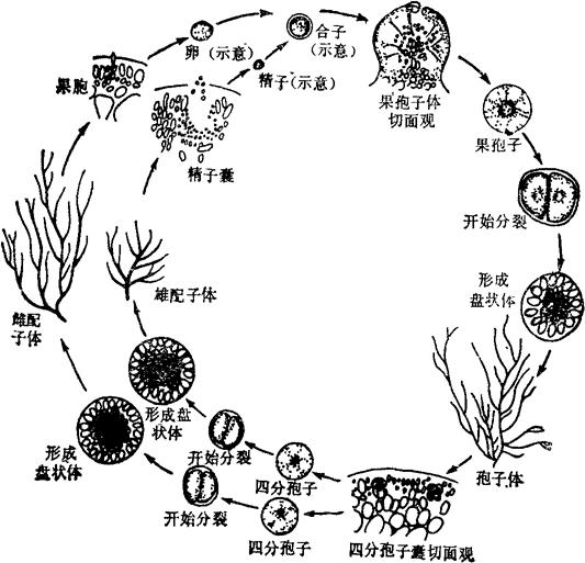 2.江蓠的生殖及生活史 江蓠的生活史通常分为三个不同的世代,即孢子体、配子体和果孢子体。三个世代是互相交替的。孢子体成熟后产生四分孢子,四分孢子萌发出来的藻体,一部分为雄配子体,一部分为雌配子体。雄配子体成熟后产生精子囊,放散精子;雌配子体成熟后产生果胞,果胞受精后经过一系列的变化,形成囊果突出藻体表面即果孢子体。果孢子体内含有许多果孢子,放散后萌发成孢子体。这样一代一代地交替下去,在同一海区、同一时期,孢子体、配子体都可以找到。江蓠染色体的数目在孢子体为双倍,配子体为单倍,而果孢子体又是双倍体。 江蓠的生殖季节在华南及福建沿海一般为春季3-5月;在我国北方沿海多为6-10月。江蓠一般为1年生海藻,孢子放散后,便附着萌发成新的藻体,而老的藻体便腐烂流失了。也有的种类为营养体繁殖,系多年生藻类。 3.江蓠孢子的萌发 一般每棵江蓠藻体大约可产生50000个孢子。孢子呈圆形,直径约30μm。不久便附着萌发,进行分裂,一星期后出现盘状体,两星期后成为直立体。以后继续萌发,一个月后便形成细小的江蓠幼苗。