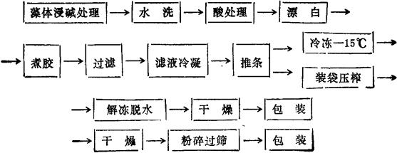 (二)江蓠的养殖 1.种苗培养 (1)水塘型养殖的细基江蓠繁枝变种主要依靠营养体繁殖,初养殖时需要从别处移植。每亩水塘投放种苗约300kg,收获时适当保留种苗,即能自然繁殖生长,不需要再专门培养种苗。 (2)在盐场贮水池中养殖的脆江蓠春夏秋季都能放散孢子生长幼苗,在珊瑚礁上养殖的凤尾菜以营养体进行繁殖,因此这两种江蓠都可以在收获时适当保留一些藻体,就可以自然繁殖生长,不需要另外培育幼苗。 (3)细基江蓠、真江蓠、绳江蓠、芋根江蓠、龙须菜等依靠放散孢子进行繁殖。需要在成熟季节将藻体阴干刺激后,放入水池中,使孢子大量放散,再把孢子水撒在浅滩上进行自然海区培育幼苗。每亩苗圃约需种藻10kg,所培幼苗可供在10亩浅滩上养殖使用。 2.分散幼苗 自然海区培养的幼苗生长到10cm左右,即把幼苗拔下,均匀地夹在维尼纶或聚乙烯制造的苗绳上,进行浮筏式养殖。苗绳规格维尼纶绳为60股(20×3),聚乙烯绳为45股(15×3)。苗距5-10cm,每簇苗3-5棵,夹在藻体中央。 3.江蓠养殖管理 (1)水塘型江蓠养殖: 水塘规格:大小1ha左右,水深30-50cm。海水比重1.005-1.015,pH8.0左右,不能低于7.0。要修建闸门及进排水沟,以便于换水。底质以沙泥底为好。总氮量在100mg/m3以上。 日常管理:每亩投放幼苗不少于300kg。养殖中要经常巡视江蓠生长情况并记录水温、比重的变化,并及时清除浒苔、水云等杂藻。每月换水2-4次。必要时在换水后施肥,投放硫酸铵或尿素每立方水1g。江蓠长满水塘后,及时收获,并适当保留种苗。 (2)浅滩型养殖江蓠: 浮筏的结构及设施:浮筏长10m、宽1m。用4条小竹(Φ5cm左右)、10条苗绳及两条浮绠(120股聚乙烯绳长15m)组成。浮筏两端绑小竹,浮绠绑在两旁,苗绳平排,相距10cm。浮绠两端绑在预先固定在浅滩上的小木桩上。筏距不小于1m。 日常管理:主要进行补苗、调整浮绠长度、加大浮力、施肥(喷撒1‰的硫酸铵),防除附泥及生物敌等。 (三)江蓠的收获及加工 水塘型养殖细基江蓠繁枝变种,一般每月收获一次,适当保留种苗让其继续生长。每年约收获8-10次。鲜干比例约为8∶1,每亩水塘年产干品200-500kg。浮筏式夹苗养殖细基江蓠、真江蓠、龙须菜等优质种类时,养殖两个月后,即可一次全部收获。鲜干比例约为10∶1,每亩浅滩可收获干品100-200kg。收获季节在华南及福建沿海为3-5月,在北方为5-7月。 加工主要为制造琼胶,其程序为: