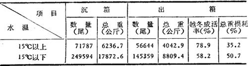 表2-100表明,水温15℃以上比水温15℃以下从池塘运鱼种入箱,能使鱼种越冬成活率提高20.7%,总重损耗减少1/3以上。即,15℃以上时进箱的鱼种,在稍适应环境后便能少量摄食,体质得到了适当恢复,病患很轻;水温15℃以下时进箱的鱼种,在稍适应环境后,因水温已降到6℃以下而不再摄食。若鱼种进箱时已近封冻,鱼种进箱后就匆忙沉箱,鱼体没有得到恢复,便会在越冬期内发生严重的水霉病。