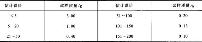 式中 m1——盛有细沙、玻棒及油脂的称量瓶在干燥前的克数(g); m2——盛有细沙、玻棒及油脂的称量瓶在恒重时的克数(g); m——样品质量(g)。 注意: 如在干燥过程中发现有质量反而增加时,可能是脂肪氧化所致或是被污染,其结果应以最低量计算。在测定精炼猪油的水分时,不要加沙,取样置称量瓶中,直接在100~105℃烘箱中干燥1h,置干燥器内15min后称量,以后每干燥30min称量一次,直到连续2次称重之差不超过0.001g为止。 3.植物油碘价测定(GB/5532-1995) (1)原理:在溶剂中溶解试样并加入wijs试剂,在规定的时间后加入碘化钾和水,用硫代硫酸钠溶液滴定析出的碘。 碘价:试样在本标准规定的操作条件下吸收碘的质量。用每100g样品吸收碘的克数表示。 (2)试剂和溶液:本标准所列试剂均为分析纯,水为蒸馏水。 ①碘化钾溶液(100g/L):不含碘酸盐或游离碘。 ②淀粉溶液:将5g可溶性淀粉在30mL水中混合,加此混合液于1000mL沸水中煮沸3min并冷却。 ③硫代硫酸钠标准溶液(0.1mol/L):配制和标定按GB 5490-1985进行。标定后7d内使用。 ④溶剂:环己烷和冰乙酸等体积混合液。 ⑤试剂:含一氯化碘的乙酸溶液。 称9g三氯化碘溶液溶解在700mL冰乙酸和300mL环己烷的混合液中。取5mL上述溶液加5mL碘化钾溶液(2①)和30mL水,用几滴淀粉溶液(2②)作指示剂,用0.1mol/L硫代硫酸钠标准溶液(2③)滴定析出的碘,滴定体积V1。 加10g纯碘于试剂中,使其完全溶解。如上法滴定,得V2。V2/V1应大于1.5,否则可稍加一点纯碘直至V2/V1略超过1.5。 将溶液静置后将上层清液倒入具塞棕色试剂瓶中,避光保存,此溶液在室温下可保存几个月。 (3)仪器、设备: ①分析天平:感量0.1mg。 ②玻璃称量皿:与试样量适宜并可置入锥形瓶中。 ③锥形瓶:容量500mL,具塞并完全干燥。 (4)试样制备: 按GB/T 15687-1995制备试样。 (5)分析步骤: ①称样:试样的质量根据估计的碘价而异,如表4-2-25所示。 表4-2-25 估计的碘价与试样的质量关系