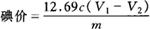 ②将称好试样的称量皿放入500mL锥形瓶中,加入20mL溶剂2④溶解试样,准确加入20mL wijs试剂2⑤盖好塞子,摇匀后将锥形瓶置于暗处。 同样用溶剂和试剂制备空白但不加试样。 对碘价低于150的样品锥形瓶应在暗处放置1h,碘价高于150和已经聚合的物质或氧化到相当程度的物质,应置于暗处2h。 ③测定。反应时间结束后加20mL碘化钾溶液2①和150mL水。 用标定的硫代硫酸钠标准溶液2③滴定至浅黄色。加几滴淀粉溶液2②继续滴定,直到剧烈摇动后蓝色刚好消失。 ④测定次数。同一试样进行2次测定。 (6)结果计算: ①碘价按每100g样品吸收碘的克数表示时由下式计算: