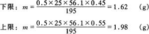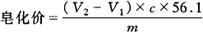 式中 V1——滴定试样用去的盐酸溶液体积(mL); V2——滴定空白用去的盐酸溶液体积(mL); c——HCI溶液的浓度(mol/L); m——试样质量(g); 56.1——KOH的摩尔质量(g/mo1)。 双试验结果允许差不超过1.0mg KOH/g油,求其平均数,即为测定结果。测定结果取小数点后一位。 (6)说明: ①制备稳定的无色氢氧化钾乙醇溶液,可采用下述方法:称取8g氢氧化钾和5g铝片,加入1000mL乙醇,加热回流1h,然后立即进行蒸馏。溶解需要量的氢氧化钾于馏出液中,静置数日后,用虹吸法将碳酸钾沉淀上面的清液吸出,贮于棕色玻璃瓶中备用。 也可以不用蒸馏的方法制备稳定的氢氧化钾溶液:在1000mL乙醇中加入4mL丁酸铝,静置数日后,慢慢倒出上层清液,溶解需要量的氢氧化钾于上清液中,静置数日后,倒出清亮的上层清液备用。 ②试样应澄清无显着杂质。如杂质过大,在测定前应加以过滤。试样的用量应视皂化价的大小而定,一般要求试样的质量调整到滴定试样所耗盐酸溶液为滴定空白时所耗盐酸溶液的45%~55%。例如:棉籽油的皂化价约为195,当空白和试样均加入0.5mol/L氢氧化钾溶液25mL时,试样用量计算如下: