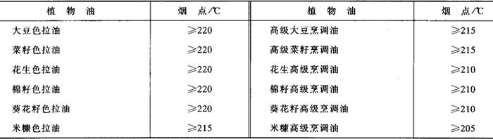 即:棉籽油试样用量应在1.62~1.98g。 ③皂化完毕后,应趁热迅速滴定,既可避免碱液吸收空气中二氧化碳影响测定结果,又可避免因冷却钾肥皂凝结(冬季时尤要注意)而无法滴定。 ④滴定过程中如溶液出现混浊,是由于盐酸溶液带入水量过多(水∶乙醇超过1∶4),此时应补加适当数量的无水乙醇以消除混浊,再进行滴定。 ⑤根据植物油皂化价鉴定油脂的纯度:如大豆油的皂化价应不小于188,由于存在外来的杂质而增加不皂化物的量,使该油样的皂化价变为172,则该批大豆油纯度为: 5.烟点的测定(GB 7653-1987) 烟点又称发烟点,是油脂接触空气加热时对它的热稳定性的一种量度。是指在避免通风并备有特殊照明的实验装置中,加热时第一次呈现蓝烟时的温度。 烟点可用做植物油精炼程度的指标。精炼好的植物油烟点在205~220℃,未精炼好的植物油如香油等的烟点在160~170℃。油脂如果长时间加热,烟点会逐渐降低。所以,油脂于高温下煎炸食品时,其烟点与油炸作业性及产品合格率有关。我国植物油标准将烟点作为各种色拉油、高级烹调油质量标准的一项。质量指标见表4-2-26。 表4-2-26 植物油烟点质量标准