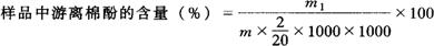 式中 V——滴定用去的硫酸溶液体积(mL); c——1/2H2SO4溶液体积(mol/L); m——试样质量(g); 0.304——油酸钠毫摩质量(g/mmo1)。 双试验结果允许差不超过0.02%,求其平均数,即为测定结果。测定结果取小数点后两位。 9.游离棉酚的测定(GB/T 5009.37-1996) (1)原理:样品中游离棉酚经提取后,在乙醇溶液中与苯胺形成黄色化合物,与标准系列比较定量。 (2)试剂: 丙酮(70%),量取70mL丙酮,加水至100mL。 乙醇(95%)。 苯胺:应为无色或淡黄,若色深则重蒸馏。 棉酚标准溶液:准确称取0.1g棉酚,置于100mL容量瓶中,加丙酮(70%)溶解并稀释至刻度。此溶液每毫升相当于1mg棉酚。 棉酚标准使用液:吸取棉酚标准溶液5.0mL,置于100mL容量瓶中,加丙酮(70%)稀释至刻度。此溶液每毫升相当于50.0μg棉酚。 (3)分析步骤: 称取约1.00g样品,置于150mL具塞锥形瓶中,加入20.0mL丙酮(70%),加入玻璃珠3~5粒,剧烈振荡1h,在冰箱中过夜,过滤,滤液备用。 在两支25mL具塞比色管中,各加入2.0mL上述滤液。以甲管为样品管,乙管为对照管。另吸取0.0、0.10、0.20、0.40、0.80、1.00mL棉酚标准使用液(相当于0、5、10、20、40、50μg棉酚)各2份,分别置于甲乙两组25mL具塞比色管中,各管均加入丙酮(70%)至2mL,甲组标准管与样品管甲管各加入3mL苯胺,在80℃水浴中加热15min,取出冷至室温,各加入乙醇至25mL;乙组标准管与样品管乙管各加乙醇至25mL。两组溶液在加乙醇后均放置15min,以甲组标准的零管为试剂空白,以乙组的零管为溶剂空白,用1cm比色皿,以各组标准零管调节零点,在波长445nm处,测定两组的吸光度,以两组对应的吸光度之差,以及相应标准浓度绘制标准曲线,以样品管甲管与乙管的吸光度之差从标准曲线查出棉酚含量。 (4)计算: