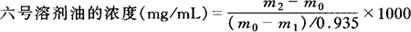 式中 m——样品质量,g; m1——测定中样液中棉酚的质量(μg)。 10.浸出溶剂的残留量(GB/T 5009.37-1996) (1)原理:将植物油样品放入密封的平衡瓶中,在一定的温度下,使残留溶剂气化达到平衡时,取液上气体注入气体相色谱中测定,与标准曲线比较定量。 (2)试剂:N,N-二甲基乙酰胺(简称DMA):吸取该试剂1mL放入100~150mL气化瓶中,在50℃放置0.5h,取液上气0.1mL注入气相色谱仪在0~4min内无干扰成分即可使用。如有干扰成分可用超声波处理30min或通入氮气用曝气法蒸去干扰成分。 六号溶剂标准溶液:称取洗净干燥的具塞20~25mL气化瓶的质量为m1,瓶中放入比气化瓶体积少1mL的DMA密塞后称量为m0,用1mL的注射器取0.5mL六号溶剂通过塞注入瓶中(不要与溶液接触),混匀,准确称量为m2。用下式计算六号溶剂油的浓度: