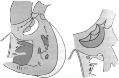 图7-2 法洛四联症位于双大动脉下的室间隔缺损 (2)肺动脉下型缺损:亦位于主动脉下,是圆锥室间隔部分或完全缺如所致(图7-2),其特点为缺损前缘是肺动脉瓣环,或与肺动脉瓣环之间有一条纤维肌肉束。可分为两种类型:一为室上嵴发育不良型,其下缘为残余室上嵴,与心脏传导束距离较远;一为室上嵴缺如型,其下缘为窦部室间隔,与嵴下型缺损下缘相似。 (3)室缺与心脏传导束的关系:法洛四联症患者,室缺与心脏传导束的相对位置关系对手术有重要指导意义。肺动脉干下型室缺后下缘与传导束距离较远,手术中一般不致损伤。但嵴下型室缺后缘与传导束较近,术中较易损伤,应引起高度注意。对于隔束后下肢发育好的患者,希氏束在距缺损后下缘较远处穿越室间隔,并深埋于此肌束内。右束支则行走于隔束后下肢与小梁室间隔,传导束不易受损伤。对于隔束后下肢发育不良的患者,希氏束在靠近缺损纤维后,下缘处穿越室间隔,右束支在缺损前下缘右室侧心内膜下行进。因此,手术时希氏束及右束支较易受损。在此区内如缝合不穿透三尖瓣环和窦部室间隔,仅缝在三尖瓣隔瓣根部和室间隔的右心室面,则无损伤希氏束和右束支而产生心脏传导阻滞的危险。 3.主动脉骑跨 法洛四联症患者,主动脉向前移位并骑跨于室间隔之上,多数病例骑跨大于50%;在部分患者可达90%。手术中常常见到升主动脉几乎遮盖较细的肺动脉。主动脉骑跨是主动脉根部右移、顺钟向转位及漏斗隔移位的结果,但主动脉无冠瓣或左冠瓣(当顺钟向转位较甚时)仍与二尖瓣前瓣间有纤维连接。主动脉的骑跨程度与右心室流出道的发育程度及漏斗部室间隔的偏移程度有关。单纯漏斗部狭窄且位置较低,有较大漏斗腔者,主动脉骑跨和旋转较轻,反之则重。有的学者认为,如主动脉骑跨超过50%,应诊断为右心室双出口。而Kirklin则认为,在有肺动脉狭窄的情况下,主动脉骑跨90%以上,方能诊断为右室双出口。 4.右心室肥厚 法洛四联症的右心室肥厚,是继发于肺动脉狭窄的病理改变,也可能与右心室高压和心内分流有关。在婴幼儿右心室肥厚较轻;随着年龄增长,逐渐加重。进入成人期如出现高血压和尿蛋白,表明右心室肥厚严重,甚至纤维化和僵硬,手术会比较困难。一般右心室壁与左心室壁厚度相等或接近相等。少数病例右心室舒张末容量降低,射血分值变小。 5.合并畸形 法洛四联症合并房缺者较多见,有人称之为法洛五联症(peritalogy of Fallot)。合并右位主动脉弓者占25%。在右位主动脉弓病例中,90%颈部大血管呈镜像反位,即第一支为左无名动脉,第二支为右颈总动脉,第三支为右锁骨下动脉。冠状动脉分支异常与手术密切有关(多为前降支起自右冠状动脉,斜行越过右心室漏斗部者占3%~5%,合并左上腔者占10%,合并动脉导管未闭者占4%,合并完全性房室通道者占2.8%)。 (二)病理生理 法洛四联症患者的病理生理主要取决于右室流出道梗阻和肺动脉狭窄的程度,其次为体循环阻力。由于室间隔缺损巨大,形成功能上的“单心室”,心室水平的血液分流取决于右室流出道阻力和体循环血管床对血流阻力的相对比值。新生儿期和婴儿期虽然从右室至肺的血流量,因右室流出道梗阻的程度而受到不同限制,但是,未闭的动脉导管可以部分“代偿”肺缺血,减轻患儿的缺氧症状。一旦导管完全闭合,动脉血氧饱和度下降,其发绀程度主要取决于右室流出道的梗阻程度。如梗阻严重,肺血减少,大量右向左分流通过非限制性室间隔缺损,造成严重低氧血症,动脉血氧饱和度下降明显,出现严重发绀甚至酸中毒;中度梗阻,则右向左分流较少,发绀较轻;轻度梗阻,则可以双向分流或者左向右分流为主,发绀很轻或无,称无发绀法洛四联症(pink tetralogy of Fallot)。巨大室间隔缺损使左右心室形成功能性“单心室”,体、肺循环平行,因而体循环阻力改变会影响肺血流。体循环阻力降低,肺血流减少;体循环阻力升高则肺血流增加。持续低氧血症刺激骨髓造血系统,红细胞增多,但在婴儿,铁的贮备及含铁食物供给有限,故有小红细胞及低血色素性贫血的倾向。严重红细胞增多导致血液浓缩、血液黏滞度增加,毛细血管血流速度降低,组织对氧摄取增加。慢性低氧血症也使肺部侧支循环血管增多、增粗,以增加肺部血流,补偿降低的动脉血氧饱和度。 (三)临床表现 1.症状 (1)发绀:是法洛四联症的主要症状。除肺动脉闭锁在出生后立即出现发绀外,75%的患儿出生后3~6个月出现发绀,但也有在儿童和成人时期才出现发绀的。这主要与右心室流出道梗阻的严重程度有关。另外动脉导管尚未闭合者发绀较轻甚至无发绀。发绀在活动和哭闹时加重,平静时减轻。 (2)蹲踞:是法洛四联症者的特征性姿态。导致肺部血流减少发绀加重的任何因素,均可使患儿出现蹲踞。蹲踞促使含氧较低的血流向上回流入右心,同时股动脉因蹲踞而弯曲,使下肢动脉血管阻力增高,流向躯干上部的血流量相对增加,使中枢神经系统缺氧状况改善;同时,体循环阻力的增高可增加心室水平的左向右分流,肺循环血流量增多,发绀迅速好转。 (3)缺氧发作和活动耐力降低:法洛四联症患者缺氧发作常在出生后6个月开始发生,又以单纯性漏斗部狭窄患儿最常见。往往发生在喂乳、啼哭或排便时,表现为呼吸困难、发绀加重、失去知觉,甚至惊厥,有时因昏迷和抽搐而死亡。发作原因可能为右室流出道漏
