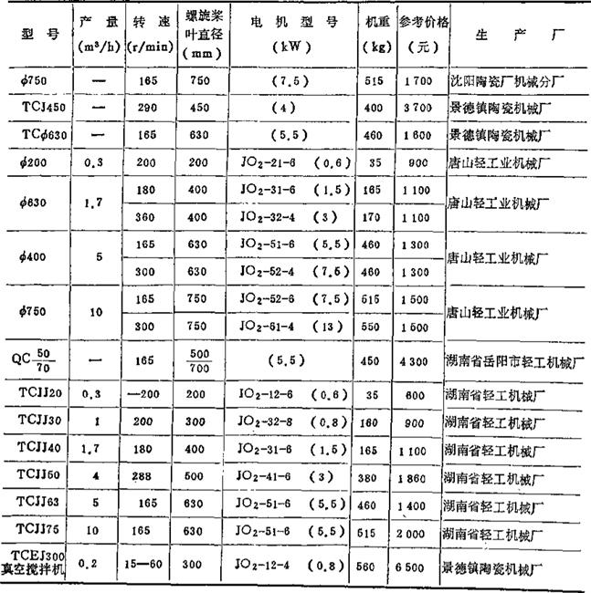 (1)对卫生瓷注型用料浆,建议采用框式搅拌机;对半干法压制或可塑法成型的料浆可采用螺旋桨式揽拌机,其螺旋角为18-23°;对回坯泥的打散搅浆处理,应采用螺旋桨式强力揽拌机,其螺旋角为22-28。