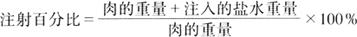 ①先用少量温水溶解磷酸盐,以防止其结块。 ②将大豆蛋白与定量的水(0~4℃)在盐水配制器中混合,充分搅拌至发亮为止。 ③将磷酸盐水溶液倒入盐水配制器中。 ④加入食盐、亚硝,充分搅拌使之溶解。 ⑤加入糖、卡拉胶、香辛料及调料等。 ⑥加入维生素C及淀粉。 (3)注射 即采用机械手段将含有配料及添加剂的腌制液均匀地输送到肌肉内部,以缩短腌制时间。 ①注射百分比的确定:注射百分比由要生产的产品的质量档次决定,并由下式计算: