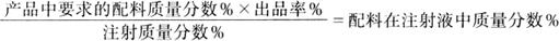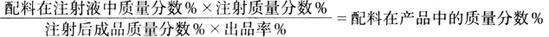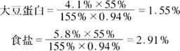 例如:一生产者在注射时注射超过净重(开始肉重)55%的注射液,并获得94%的蒸煮得率,在注射液中含有4.1%大豆蛋白及5.8%的食盐,各配料注射入制品中的质量分数是多少?