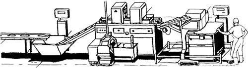(4)注射操作 ①动脉注射:把屠宰后的猪胸部切开,将注射针头从心脏的左心室插入大动脉中,然后在右心室打个孔,用与血压相同的压力,通过泵将腌制液送入血管内,也可通过体表动脉将腌制液注入肌肉内部。动脉注射要求原料肉块形完整,动脉保持完好,并且是带骨的肌肉,这种注射方法比较费时,一般不采用。 ②单针头注射法:使用侧面多孔的注射针,插入关节或其它难以浸透的部位。一般常用的是通过泵将腌者液注入肌肉内的方法,腌制液的浓度较高,注射量为原料肉的8%~10%,在盐渍前注射一次。 ③多针头注射法:由多针头注射机将注射液注入肌肉内部。多针头注射机有两种类型:低压注射系统(大多数注射机都属于这种类型)和喷雾注射系统。两者之间的主要区别是将注射液送入肉中的方式不同:低压注射机在针头插入肉中时将注射液沉积在肉中,针头上通常有2~4个直径为1mm的孔,沉积的盐水穴必须通过机械作用或长时间腌制才能使之分散开。使用低压注射机时,注射压力一般为196~392kPa,并且压力越大,对肉损伤越大。而高压注射机是当针头彻底插入肉中时用定容活塞将注射液形成高压微小的液滴,均匀地分散到整个肉块中,一般不会造成注射液沉积。高压注射机针头上通有11~14个分布于不同高度的,直径为0.6mm的针孔。用这种注射机注射时注射压力一般为784~1176KPa。并且,压力越大,液滴直径越小,速度越快,穿透力越强,所以对肌纤维破坏越小,注射精确性越高。多针头注射机从针头排列上有双针头与单针头之分。 多针头注射机的操作: a.在注射之前首先要检查注射针头是否畅通,方法是将盐水槽内倒满腌制液,开启输送泵,启动注射针头,将专用塑料块填进注射针头下面,当针头下降到最低位置时,将注射机关停,然后单独开启输送泵,观察针头注射液喷射情况,若每个针头的针孔都有注射液喷出,说明注射循环系统畅通。 b.确定注射压力,在进行大批量注射之前,先取一小部分肉块,在注射前称重,分别用不同的压力进行注射,注射后称重,求得各压力下的注射百分比,根据配方设计的注射百分率,确定注射压力。 c.确定注射压力后,就可进行大批量操作了。在进行大批量注射时,一定要注意将肉块单层均匀地摆放到注射机的输送带上,而不能使肉块与肉块之间互相挤压,图2-8-5所示为注射操作生产线示意图。