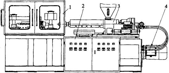 图2-11-12 注射吹塑成型机 1-罩门 2-电气控制箱 3-注射装置 4-液压气动系统 2.2.1 注射装置 与普通注射机注射部分的结构类似。塑料在机筒筒里熔融塑化后,在一定的压力下注入注射型坯模,成型型坯。型坯模一般采用一模多腔型式,因此注射装置还需配一套热流道系统,其喷嘴必须与模具型腔相对应。 2.2.2 注射合模装置 与立式注射机合模装置相似,下模板固定,上模板在垂直方向上上下移动,使安装在模板上对半开的模具闭合或开启。合模油缸和一套曲轴连杆机构提供足够的合模力,以保证注射成型型坯时,锁紧模具。模板尺寸应保证有足够的安装模具的位置。移模行程必须保证模具开启时,带着型坯或制品的芯棒自由地进行转送。芯棒水平安装在回转盘上,合模时位于半开模具的分型面上,要求有严格的定位。 2.2.3 吹塑合模装置 模板的安装方式、模板尺寸、移模方式和移模行程等应尽可能地与注射合模一致或相匹配。由于吹塑所需的合模力不大,因此采用液压直压式合模机构,提供必须的合模力,保证吹塑成型。 2.2.4 制品取出装置 采用气缸带动连杆驱动推料板顶落制品的结构方式。 2.2.5 回转台装置 图2-11-13所示为注射吹塑成型机回转台结构原理示意图。它由油缸、齿条、齿轮、芯轴、离合器、气缸、回转盘、定位销及配气配油体等组成。回转盘上装有模具芯棒。图2-11-14所示为常用的模具芯棒结构型式。