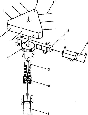 图2-11-13 回转台装置结构示意图 1-气缸 2-推力轴承 3-离合器 4-油缸 5-齿条 6-芯棒 7-回转盘 8-齿轮