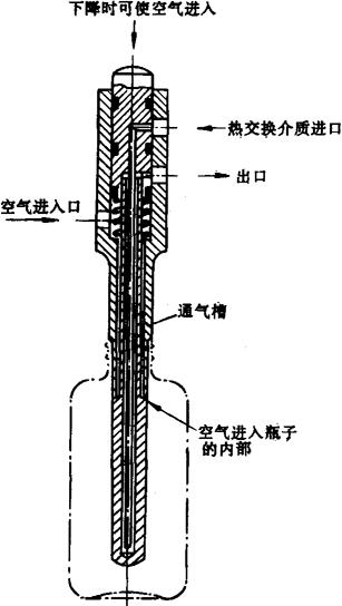 图2-11-14 模具芯棒结构简图 如图2-11-13所示油缸4驱动齿条5带动齿轮使回转盘7回转,转送模具芯棒6至要求工位。气缸1使芯轴上下移动,带动回转盘7上升或下降。上升时,离合器3啮合,可使回转盘7转过一定角度;下降时,离合器脱开,油缸复位,齿轮空转。定位销定位,这时可同时进行注射模合模、吹塑模合模及制品顶出。配气配油体的作用是在适当的时候,通过回转盘通道向模具芯棒提供吹塑气压和始终向模具芯棒提供载热油体,以控制芯棒温度。 2.2.6 液压传动、气动系统及电控程序系统 采用电液气联合控制整机动作程序。电控方面采用可编程序控制器(PC)进行程序编排和控制。液压系统采用双联叶片泵,提供13.72MPa压力和三级流量的压力油作动力,通过液压元件驱动注射装置的各执行元件动作,包括预塑、注射及防流涎、整体前进和后退等,以及回转台回转及复位、注射合模及吹塑合模装置的启闭等动作。气动系统要求气源提供0.98MPa以上的压力气体,通过气压元件操纵回转台升降、制品取出、型坯吹塑等动作。 2.2.7 安全保护装置 注射吹塑成型机成型部分设有安全罩门防护,门上装有安全开关,当门开启时,程序不工作。此外,当制品转送至制品取出工位,因为是废品或其他原因不能从芯棒上顶落时,在芯棒带它向注塑工位转送时,将触动另设的微动开关,使机器停止工作。 3 辅助设备及选用原则 注射吹塑成型机一般需备有下列辅助设备。 3.1 模温控制系统 由多个模温控制器提供不同温度的热介质,分别对模具芯棒及注射型坯模的型腔各段(颈部除外)进行温度控制,以保证吹塑工艺对型坯各段的温度要求。 3.2 冷却系统 一般是采用冷冻机提供5~10℃过冷水(也可直接用自来水)对注射模瓶颈部分以及吹塑模进行冷却。 3.3 空气压缩机 为了保证机器气动动作的正常进行,以及保证吹塑所需的气压,一般要配备1台足够排量的,压力在10MPa以上的空压机。 3.4 吹塑空气净化装置 为使塑料容器内壁免受不洁空气污染、注射吹塑成型机一般还配备1台一定容量的冷冻式压缩空气干燥机。 |