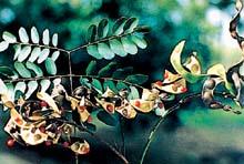 豆科。落叶乔木。叶互生,二回羽状复叶,羽片4~6对,小叶长圆形或卵状椭圆形。花小,白色或淡黄色,成狭窄的总状花序,萼倒圆锥形,顶部具5个裂齿,外被细毛;瓣5枚,卵状披针形。