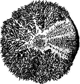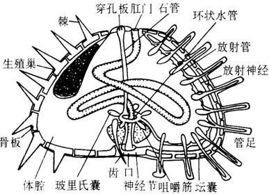 图5-3 马粪海胆的外部形态 海胆的顶系和围口部分别位于胆壳的背、腹面中央。顶系由围肛部、5块生殖板和5块眼板构成。生殖板和眼板分别对应于间步带区和步带区,两者相间排列。海胆的生殖腺以系膜紧贴在间步带区的生殖板内壁上,生殖腺在反口面变得狭窄形成生殖输送管,生殖产物通过生殖孔排出体外。而眼板上有起感觉作用的眼孔。正形目的围口部多为柔软的膜质,膜质中常有少数的骨板,在口的周围排列5对规则的口板,各板上有一管足。歪形目的围口部,多偏于壳的前方,由许多石灰质小板构成,小板上无管足。围口部后面的一个间步带板较大,称为唇板。海胆的口内有被称为亚氏提灯的特殊咀嚼器,由5个辐射状排列的齿及肌肉和骨片组成。由管足和棘刺捕捉食物用咀嚼器磨碎后吞食。咀嚼器下接食道,食道后接肠,肠在体腔内弯曲后经直肠通过反口面开口于肛门(图5-4)。
