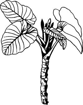 图2-166 海芋 (1)植物学特征。海芋,天南星科,海芋属,多年生草本植物。植株高大、茎粗壮、叶大,阔箭形,佛焰苞黄绿色,肉穗花序,根棒状,花期夏季,浆果,浅红色。 (2)对环境与土壤的要求。海芋喜温暖、湿润、半阴环境。畏寒冷。好生于富含腐殖质的砂质壤土。盆栽时,可用腐叶土、园土和粗砂混合配制的培养土。 (3)施肥技术。生长季节宜保持土壤湿润,并每月追施1~2次以氮肥为主的稀薄液肥。越冬期间要控制浇水,停止施肥。 |