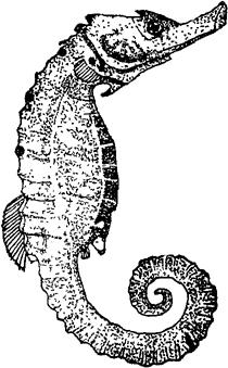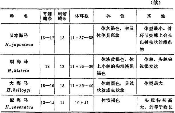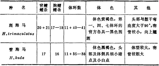 | 释义 | 海马养殖 海马为浅海小型鱼类,是珍贵的海产药物,素有“南方人参”之美称。 一、海马的形态特征及分布 海马属硬骨鱼纲,刺鱼目,海龙科,海马属(Hippocampus)。全世界约25种,我国已知有6种。海马头呈马头状,体侧扁,腹部凸出,躯干部及尾部由数十节骨质体环所包。吻细长,管状。口小,位于吻端。背鳍、臀鳍、胸鳍细小,无腹鳍及尾鳍。雄鱼尾部腹面有育儿囊。各种主要特征见表37—1及图37—4、5。 表37—1 海马形态特征比较表