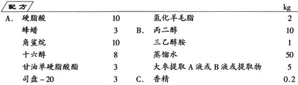 大枣提取液的制备如下:将100kg大枣粗略切碎,加入450L无水乙醇和50L水(也可用500L工业酒精),浸渍搅拌24h,然后抽滤,除去滤液。将过滤后的残留物置于容器内,用90%的乙醇溶液浸渍,搅拌,提取。抽滤后的残留物再用90%的乙醇溶液浸渍,搅拌,提取。抽滤后的残留物再用40%的乙醇溶液浸渍3~7d,不断搅拌。然后过滤,收集滤液。若滤液有混浊现象时,可用硅藻土过滤,得到透明澄清的滤液,即为A液。在A液中加入甘油、1,3-丁二醇、乙二醇等多元醇溶剂,得到的溶液为B液。A液在碱压下蒸去乙醇,即得到粉末状大枣提取物。