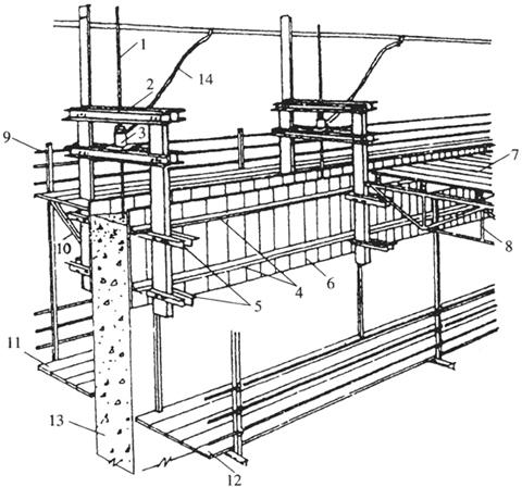 图9-31 滑动模板组成示意图 1-支承杆;2-提升架;3-液压千斤顶;4-围圈;5-围圈支托;6-模板;7-操作平台;8-平台桁架;9-栏杆;10-外挑三角架;11-外吊脚手;12-内吊脚手;13-混凝土墙体;14-油管 1.模板系统 模板系统包括模板、围圈、提升架和附属配件等,最主要的是前三者。 (1)模板 模板又称为圈板,其主要作用是确保混凝土按照设计要求的结构形体尺寸准确成型,保证混凝土表面质量符合要求,并承受新浇筑混凝土的侧压力、冲击力和在滑升过程中混凝土对模板产生的摩擦阻力;另外,还要保证结构内的配筋、门窗洞口模板、预埋管线等,能顺利地从模板上口安装施工。 模板可采用钢材、木材或钢木混合材料制作而成,目前以钢材制作为主,这样可提高模板的周转率,减小工程中的摊销费用。在制作时,模板间的拼缝必须是垂直缝,这样有利于模板的滑动。 模板的高度主要取决于其滑升速度和混凝土达到自承重出模强度(0.2~0.4N/mm2)所需的时间,一般为900~1200mm。为了减少滑升时模板与混凝土的摩擦阻力,便于模板顺利脱出,模板安装后其内外模板应形成上口小下口大的锥度(倾斜度),并使模板高在下口以上1/4~1/2高度处的净间距为结构的设计厚度,单模板的锥度为0.3%~0.5%。 模板支承在围圈上,与围圈的连接一般有两种方法:一种是将模板挂在围圈上;另一种是模板搁置在围圈上。前者装拆比较费事,后者装拆比较方便,但需要有相应措施进行固定。 (2)围圈 围圈在模板的外侧横向布置,在一般情况下上下各布置一道,分别支承在提升架的立柱上,把模板和提升架联系在一起,构成模板系统,当提升架提升时,通过围圈带动模板,使模板随之向上滑升。 围圈的作用是固定模板的位置,保证模板所构成的几何形状不变,同时承受由模板传来的水平力(新浇筑混凝土的侧压力、冲击力和风荷载)和垂直力(主要为模板滑升时的摩阻力),有时还可能要承受操作平台及挑平台传递的荷载。 围圈可以用角钢、槽钢或工字钢制作而成,上、下围圈的间距,应根据模板的高度而定,以使模板受力时变形最小为原则。 (3)提升架 提升架又称门架或千斤顶架,其作用是约束固定围圈的位置,防止模板的侧变形;承受作用整个模板上的竖向荷载;将模板系统和操作平台系统连成一体,并将模板系统和操作平台的全部荷载传递给千斤顶和支承杆。提升架主要承受围圈传来的垂直和水平荷载,操作平台、内外挑挂脚手的荷载,其他设计荷载等。 提升架常用12号槽钢制作横梁,用12~16号槽钢做成单肢式、格构式或桁架式。在建筑工程中常用的提升架开型架(两横梁式)和Ⅱ型架(单横梁式)两种,如图9-32所示。立柱与横梁的连接方式有两种,一种是全部采用螺栓连接,另一种是一端采用焊接另一端采用螺栓连接。