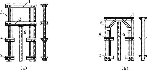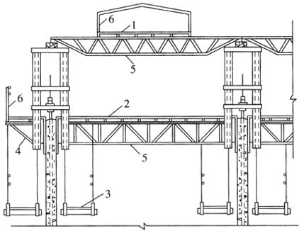 图9-32 提升架示意图 (a)两横梁式;(b)单横梁式 1-上横梁;2-下横梁;3-立柱;4-上围圈支托;5-下围圈支托;6-套管 2.操作平台系统 操作平台又称工作平台,主要包括主操作平台、外挑操作平台、内外吊脚手等,根据施工中的需要,还可以设置辅助平台,如图9-33所示。