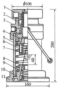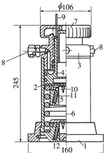 图9-34 钢珠式千斤顶 1-底座;2-缸筒;3-缸盖;4-活塞;5-上卡头;6-排油弹簧;7-行程调整帽;8-油嘴;9-行程指示杆;10-钢珠;11-卡头小弹簧;12-下卡头