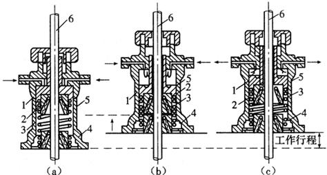 图9-35 楔块式千斤顶 1-行程调整帽;2-活塞;3-缸盖;4-上卡头块;5-缸筒;6-上卡块座;7-排油弹簧;8-下卡头块;9-弹簧;10-下卡块座;11-底座能力为30~50kN的千斤顶属小型千斤顶,60~120kN的属中型千斤顶,大于120kN的属大型千斤顶,在液压滑动模板应用最多的是小型液压千斤顶。 在进行滑升施工时液压千斤顶是安装在提升架的横梁上,支承杆插入千斤顶的中心孔内。提升时,利用油泵,通过控制阀门和输油管,把油液从千斤顶的进油口压入活塞和缸盖之间进行加压(图9-36a)。在加压时,由上卡头(与活塞联成一体)内的小钢珠与支承杆产生自锁作用,使上卡头与支承杆锁紧,使活塞不能下行。在一定油压力的作用下,缸筒连带底座和下卡头便被向上顶起,相应地带动提升架等整个滑动模板上升。当上升到下卡头紧靠上卡头时,即完成一个工作行程(图9-36b)。这时排油弹簧处于压缩状态,上下卡头承受着滑动模板的荷载。当油泵停止供油,进行回油时,油压力被解除,在排油弹簧和弹力作用下,把活塞推举向上,油便从进油口排出。在排油开始的瞬间,下卡头由于小钢珠和支承杆的自锁作用,与支承杆锁紧,使缸筒和底座不能下降,接替支承着上卡头所承受的荷载(图9-36c)。当活塞上升到缸体顶部后,排油工作亦即完毕,这时千斤顶便完成一次上升的工作循环。