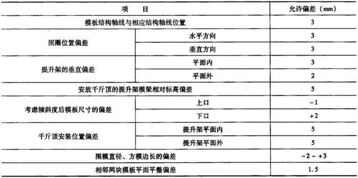 注:当采用人工捣实时,非泵送混凝土的坍落度可适当增加。 ④如果在混凝土中掺入外加剂或掺合料时,其品种和掺量必须通过试验确定;当因某种原因改变混凝土的配合比时,也应通过现场滑升试验确定。 ⑤当采用高强度混凝土时,还应满足流动性、可泵性和可滑性等方面的要求,并应使入模后的混凝土凝结速度与模板滑升速度相适应。混凝土配合比设计初步确定后,应先进行模拟试验,再根据情况进行调整。 ⑥混凝土的初凝时间一般宜控制在2h左右,其终凝时间可根据工程对象而定,一般宜控制在4~6h。 (2)对混凝土的浇筑要求 用于滑动模板施工的混凝土,在浇筑过程中应符合下列规定: ①必须分层均匀环绕模板浇筑,每一浇筑层的混凝土表面应在一个水平面上,并应有计划匀称地交换浇筑方面,以使混凝土保持均匀一致。 ②混凝土分层浇筑的厚度不宜大于200mm,各层浇筑的间隔时间,不应大于混凝土的初凝时间,即相当于混凝土达0.35kN/cm贯入阻力值。当间隔时间超过时,对接槎处应按施工缝的要求进行处理。 ③在高温施工季节,宜先浇筑内墙的混凝土,后再浇筑阳光直射的外墙;先浇筑直线段的墙体,后浇筑墙角和墙垛;先浇筑尺寸较大的墙体,后浇筑薄墙。 ④预留孔洞、门窗口、烟道口、变形缝及通风管道等两侧的混凝土,应当对称均匀进行浇筑。 (3)对混凝土的振捣要求 用于滑动模板施工的混凝土,在振捣的过程中应符合下列规定: ①在进行振捣混凝土时,振捣器不得直接触及支承杆、钢筋和模板,应离开它们一定的距离。 ②振捣器应当插入已振实的混凝土中,以便于上下层混凝土成为一个整体,但插入的深度不得超过50mm。 ③在滑动模板滑升的过程中,不得进行振捣混凝土作业。 5.液压滑升 (1)初滑时模板内浇筑的混凝土至500~700mm高度后,第一层混凝土的强度达到0.2MPa,应进行1~2个千斤顶行程的提升,并对滑模装置和混凝土的凝结状态进行检查,确定正常后,方可转为正常滑升。 (2)在正常滑升的过程中,两次提升的时间间隔不宜超过0.5h。 (3)在提升的过程中,应使所有的千斤顶充分的进油、排油。提升过程中,如出现油压增至正常滑升工作压力值的1.2倍,尚不能使全部千斤顶升起时,应停止提升操作,立即检查原因,及时进行处理。 (4)在正常滑升过程中,操作平台应保持基本水平。每滑升200~400mm,应对各千斤顶进行一次调平,特殊结构或特殊部位应按施工组织设计的相应要求实施。各千斤顶的相对高差不得大于40mm。相邻两个提升架上千斤顶升差不得超过20mm。 (5)在滑升过程中,应检查和记录结构垂直度、水平度、扭转及结构截面尺寸等偏差数据,及时进行纠偏、纠扭工作。在纠正结构垂直度偏差时,应缓慢进行,避免出现硬弯。 (6)在滑升过程中,应随时检查操作平台结构,支承杆的工作状态及混凝土的凝结状态,如果发现异常现象,应及时分析原因,并采取有效的处理措施。 (7)因施工需要或其他原因,模板不能正常连续滑升时,应采取下列停滑措施: ①混凝土应当浇筑至同一标高,使混凝土表面基本上水平一致。 ②模板要每隔一定时间提升1~2个千斤顶行程,直至模板与混凝土不再粘结为止。对滑空部位的支承杆,应采取适当的加固措施。 ③当再继续正常滑升施工中,应对模板系统和液压系统进行检查。 (五)滑动模板组装质量要求 滑动模板在组装完毕后,必须按照表9-2中所列各项质量标准进行认真检查,发现问题应立即纠正,并做好记录。 表9-2 滑动模板组装的允许偏差