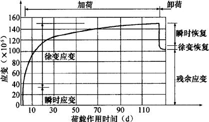 图5-24 混凝土的三种变形模量 2.长期荷载作用下的变形 混凝土在荷载的长期作用下,除了产生瞬间的弹性变形和塑性变形外,还会产生随时间增长而沿受力方向增加的非弹性变形,这种变形称为混凝土的徐变。图5-25表示混凝土的徐变曲线。