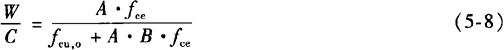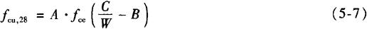 式中 fcu,28——混凝土28d龄期立方体抗压强度(MPa); fce——水泥实际强度(MPa),fce可通过试验确定,也可根据《普通混凝土配合比设计规程》(JGJ55-2000)中的规定,取水泥强度富余系数为1.13,按fce=1.13fc计算,其中fc为水泥强度等级; C——每立方米混凝土中水泥用量(kg); W——每立方米混凝土中水的用量(kg); A,B——经验系数,与骨料品种等有关。当采用碎石时:A=0.46,B=0.07;采用卵石时,A=0.48,B=0.33。 根据混凝土强度公式(5-7),可推导出满足配制强度要求的水灰比,见式(5-8):