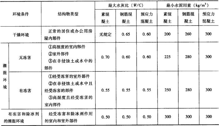 混凝土工程实践证明:混凝土的水灰比不仅要满足强度的要求,而且还要满足耐久性的要求,这是配制混凝土不可缺少的条件。 根据行业标准《普通混凝土配合比设计规程》(JGJ55-2000)中的规定,混凝土的最大水灰比和最小水泥用量,如表5-59所示。最后应在按强度计算出的水灰比与查表所得的水灰比中,选用其中较小的一个值作为混凝土的设计水灰比。 表5-59 混凝土的最大水灰比和最小水泥用量(JGJ55-2000)