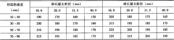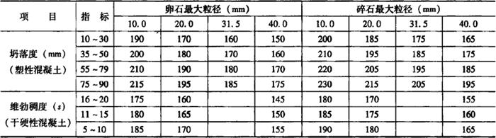 注:当用活性掺合料取代部分水泥时,表中的最大水灰比及最小水泥用量即为替代前的水灰比及水泥用量。 (3)确定混凝土的用水量(W0) 根据混凝土施工所要求的坍落度(表5-57),以及所用骨料的品种、最大粒径等因素,参考表5-60选用1m3混凝土的用水量。 表5-60 混凝土用水量选用表(JGJ55-2000) (kg/m3)
