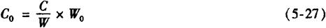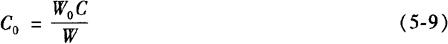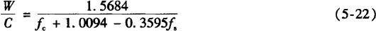 注:1.本表不宜用于水灰比小于0.40或大于0.80的混凝土。 2.本表用水量采用中砂时的平均值,若用细(粗)砂时,每立方米混凝土用水量可增加(减少)5~10kg。 3.掺用外加剂(掺合料),可相应增减用水量。 (4)确定混凝土水泥用量(C0) 根据确定出的水灰比(W/C)和1m3混凝土的用水量(W0),用式(5-9)可求出1m3混凝土中的水泥用量(C0)。