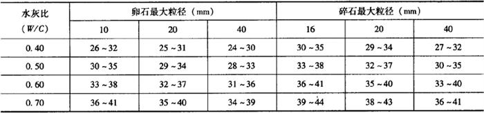 注:1.滑模摊铺机适宜的摊铺速度应控制在0.5~2.0m/min之间。 2.本表适用于设超铺角的滑模摊铺机;对不设超铺角的滑模摊铺机,最佳振动黏度系数为N·s/m2;最佳坍落度卵石混凝土为10~40mm,碎石混凝土为10~30mm。 3.滑模摊铺时的最大单位用水量,卵石混凝土不宜大于155kg/rn3,碎石混凝土不宜大于160kg/m3。 最后单位用水量应取计算值和表5-68、表5-69中的规定值两者中的小值。如果实际单位用水量仅掺引气剂不满足所取数值,则应掺用引气(高效)减水剂。三、四级公路也可以采用真空脱水施工工艺。 表5-68 混凝土单位用水量选用表 (kg/m3)