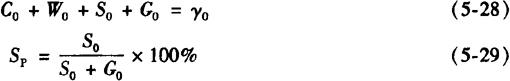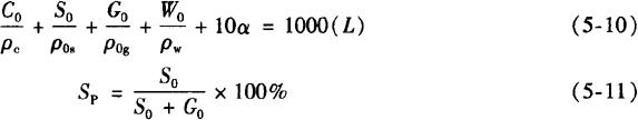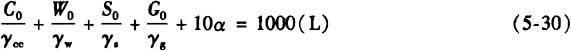 式中 C0,W0,S0,G0——分别为水泥、水、砂和石子的单位用量(kg); γ0——假定混凝土的单位体积质量(kg); Sp——混凝土的砂率(%)。 (2)按体积法计算 体积法计算砂石用量,可按式(5-30)和式(5-29)联立计算: