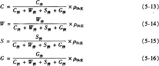 注:1.本表适用于坍落度为10~60mm的混凝土。坍落度若大于60mm,应在上表的基础上,按坍落度每增大20mm砂率增大1%的幅度予以调整。 2.本表数值系采用中砂时选用的砂率,若用细(粗)砂,可相应减少(增加)砂率。 3.只用一个单粒级骨料配制的混凝土,砂率应适当增加。 4.掺有外加材料时,合理砂率经试验或参考有关规定选用。 (6)计算粗、细骨料的用量(S0,G0) 在混凝土配合比组成材料用量计算中,确定砂、石骨料用量的方法很多,最常用的是绝对体积法和假定表观密度法。 1)绝对体积法。绝对体积法是假定混凝土拌合物的体积等于各组成材料的绝对体积和拌合物中所含空气的体积之和。因此,在计算1m3混凝土拌合物的各材料用量时,可列出式(5-10)。再根据砂率的计算公式(5-11),将式(5-10)和式(5-11)联立,即可求出1m3混凝土中砂(S0)、石子(G0)的用量。