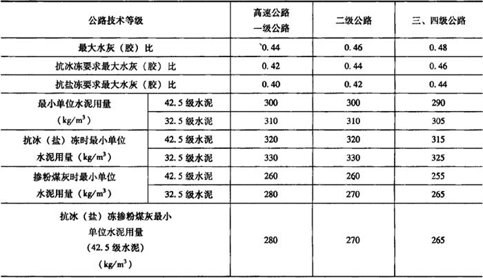 (2)当掺用粉煤灰时,应计入超量取代法中代替水泥的那一部分粉煤灰用量(代替砂的超量部分不计入),用水胶比[W/(C+F)]代替水灰比(W/C)。 (3)应在满足弯拉强度计算值和耐久性(如表5-64所示)两者要求的水灰(胶)比中选取小值。 表5-64 混凝土满足耐久性要求的最大水灰(胶)比和最小单位水泥用量