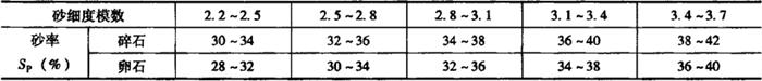 注:1.掺粉煤灰,并有抗冰(盐)冻性要求时,不得使用32.5级水泥。 2.水灰(胶)比计算以砂石料的自然风干状态计(砂含水量≤1.0%,石子含水量≤0.5%)。 3.处在除冰盐、海风、酸雨或硫酸盐等腐蚀性环境中,或在大纵坡等加减速车道上的混凝土,最大水灰(胶)比可比表中数值降低0.01%~0.02%。 3.确定混凝土砂率 砂率应根据砂的细度模数和粗骨料的种类,查表5-65确定混凝土的砂率。在做软抗滑槽时,砂率可在表5-65的基础上增大1%~2%。 表5-65 砂的细度模数与最优砂率的关系