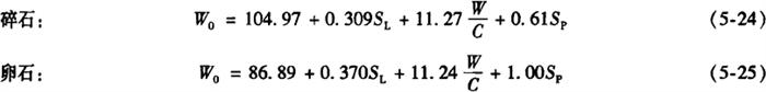 4.确定单位用水量 根据粗骨料种类和表5-66和表5-67中的适宜坍落度,分别按下列经验公式计算单位用水量(砂石料以自然风干状态计):