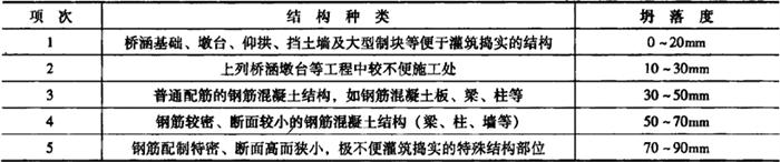 式中 W0——不掺外加剂与掺合料混凝土的单位用水量(kg/m3); SL——混凝土拌合物的坍落度(mm); SP——混凝土的砂率(%); C/W——灰水比,水灰比的倒数。 对于掺加外加剂的混凝土单位用水量,可按式(5-26)进行计算: W0w=W0(1-β) (5-26) 式中 W0w——掺加外加剂混凝土的单位用水量(kg/m3); β——所用外加剂剂量的实测减水率(%)。 表5-66 公路桥涵用混凝土拌合物的坍落度