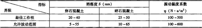 注:1.使用高频振捣器时,其混凝士坍落度可适当减小。 2.本表系指采用机械振捣的坍落度,采用人工振捣时可适当放大。 3.需要配置大坍落度混凝土时,应掺加外加剂。 4.曲面或斜面结构的混凝土,其坍落度应根据实际需要另行选定。 5.轻骨料混凝土的坍落度,宜比表中数值减少10~20mm。 表5-67 混凝土路面滑模摊铺最佳工作性及允许范围
