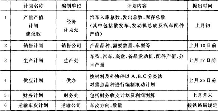 图1 当前我国汽车行业采取滚动法编制计划的时间并不长,尚属于摸索和实践的过程中。它是在国家计划的指导下,根据销售情况和市场上需要汽车的数量、品种、交货期的调查和预测,结合各方面客观条件的变化而编制成。如近年来,汽车的产销变化很大,1981年由于国家节油封车政策及其它种种原因,在我国汽车行业出现了汽车产品滞销的现象。1983年又出现了供不应求的局面。由于供需情况的不断变化,常常需要企业的生产计划和与之有关的工作进行调整。如有些老产品不能适销,迫切需要进行某些改进;有些耗能高的产品迫切需要淘汰;有些新产品在市场上受到欢迎,但产量较小,迫切需要增加产量等等。这样,汽车生产的品种、数量、交货期在年初虽然已经明确,但是在执行过程中,仍然需要调整。汽车行业运用滚动方法编制计划,就是把生产经营计划分成两个部分,一部分是必保的实施执行计划,一部分是准备和预测计划,以此循环,来保持组织生产过程中的协调和衔接。 滚动计划适用于中、长期计划,也可用于短期计划。在短期计划工作中,可以是年度计划的滚动,也可以是半年的或季度计划的滚动。例如,第一汽车制造厂现在应用滚动法编制计划,是月份计划的滚动,即是以四个月为一个滚动期,叫做:必保当月,确定下月,(供应部门以第1个月为备料目标),准备预测第三、四个月,按月把预测、计划和实际执行情况的差异经过分析修订,逐月制订滚动计划。如1982年12月份制订出1983年1月份的执行计划,同时制订出2、3、4月份的计划,1983年1月份制订出2月份的执行计划,同时制订出3、4、5月份的计划,以此类推。 为什么是四个月为一个滚动期,而不是三个月(一个季度)为一个滚动期呢?这主要考虑了滚动计划与现有季度计划的衔接关系,拿一汽来说,虽然工厂内部实行了滚动计划,而各级主管部门并没有改变现有的计划体制,如年度、季度计划的上报和批准下达,为了把现行的季度计划与滚动计划很好的结合起来,以四个月为一个滚动期,当编制3-5月份滚动计划的时候,正好是要编制二季度计划的时候,因此四个月为一期,就可以同时产生了二季度计划,比较好地解决了工厂内部需要与上报的关系。 二、滚动计划的内容 滚动计划在工厂内部不是所有的计划都实行滚动,而是主要的生产经营计划进行滚动,包括以下内容: 1.产量产值计划建议数; 2.销售计划; 3.生产计划; 4.供应计划; 5.财务计划; 6.车皮运输计划。 它的编制单位和计划内容如表1所列: 表1