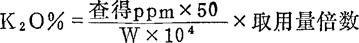 吸取上述待测液1-5ml(约含250-2500μgK2O)于50ml容量瓶中,定容,与氧化钾系列标准液一起在火焰光度计上测定,读取电流计读数,在工作曲线上查出其ppm值。