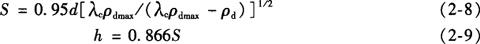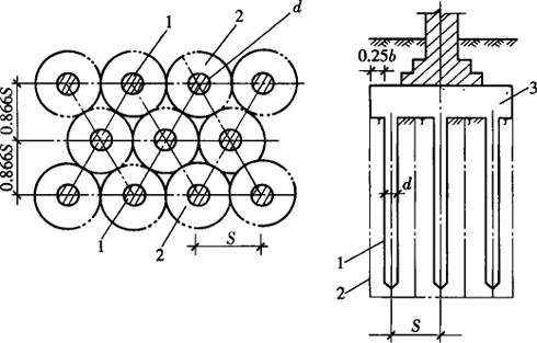 式中 S——灰土桩的间距(mm); d——灰土桩桩孔直径(mm); λ。——地基排密后,桩间土的平均压实系数,一般取0.93; ρdmax——桩间土的最大干密度(t/m3); ρd——地基挤密前土的平均干密度(t/m3); h——桩的排距(mm)。