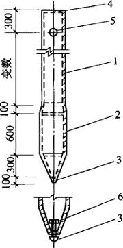 图2-7 灰土桩及灰土垫层的布置 1-灰土挤密桩;2-桩的有效挤密范围;3-灰土垫层 d-桩的直径;S-桩距(2.5d~3.0d);b-基础宽度 整片处理宜用于Ⅲ、Ⅳ级自重湿陷性黄土场地,每边超出建筑物外墙基础边缘的宽度不宜小于处理土层厚度的1/2,并不应小于2.0m。 2.灰土桩对材料的要求 灰土桩内的填料应根据工程要求或处理地基的目的确定,但所用材料应符合以下要求: (1)生石灰应经消解3~4d后过筛,粒径不大于5mm。石灰的质量不得低于Ⅲ级的要求,活性CaO+MgO含量的质量分数(按干重)不小于50%。 (2)加入的灰土含水量应尽量接近其最优含水量值,当含水量超过其最优值±3%时,应进行晾晒或洒水湿润处理。 (3)灰土的配合比应符合设计要求,在基础处理中常用的配合比为2∶8或3∶7(体积比)。灰土配制应计量准确、拌合均匀、颜色一致,并要随拌随填,及时填入桩孔,不宜隔日使用。 (4)灰土桩中的灰土夯实质量应用压实系数控制,其压实系数不应小于0.97。 (五)灰土桩的施工要点 1.灰土桩的施工设备 灰土桩施工设备,主要需要成孔设备和夯实机具,这是灰土桩不可缺少的机械设备,不仅影响灰土桩的施工速度、操作难易,而且关系到灰土桩的施工质量和造价高低。 (1)成孔设备 灰土桩的成孔设备应根据土质种类、要求进度、技术水平等综合考虑,一般情况下可采用0.6t或1.2t柴油打桩机或自制锤击式打桩机,也可采用冲击钻机或洛阳铲成孔。 (2)夯实机具 灰土桩常用的夯实机具有偏心轮夹杆式夯实机和卷扬机提升式夯实机两种,卷扬机提升式夯实机在工程中应用较多。夯锤多用铸钢或铸铁制成,重量一般选用100~300kg,其竖向投影面积的压力不小于20kPa。夯锤最大部分的直径应比灰土桩的直径小100~150mm,以便能使填料顺利通过夯锤四周。夯锤形状下端应为抛物线形锥体或尖锥形锥体,上段成弧形。 2.灰土桩的成孔方法 根据以上所用成孔设备,灰土桩的成孔方法可分为沉管法、冲击法、洛阳铲法,有时也可选用爆扩法等。 (1)沉管法成孔 沉管法是利用打桩机将与灰土桩同直径的钢管打入地基中,使土向孔的四周挤密,然后缓慢地将钢管拔出而成孔。桩管的顶部设置桩帽,下端做成角度为60°的圆锥体,桩尖可以上下活动(见图2-8),以利于空气的流动,并可减少拔管时的阻力,避免出现塌孔现象。