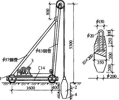 图2-8 桩管构造示意图 1-Φ275mm无缝钢管;2-Φ300mm×10mm无缝钢管;3-活动桩尖顶;4-10mm厚封头板(设Φ300mm排气孔);5-45mm管焊于桩管内,穿M40螺栓;6-重块 成孔后应及时拔出桩管,不要在土中留置时间过长,防止四周土体挤压钢管,造成拔管困难。在成孔施工时,地基土的含水量最好在最优含水量状态,当含水量低于12%(质量分数)时,宜对地基进行适当加水至最优含水量。 沉管法施工简单易行,孔壁光滑平整,挤密效果好,应用较广泛。但处理深度受到桩架的限制,一般不超过8m;另外,如果地基中含有较多的石块等,也不容易沉管。 (2)冲击法成孔 冲击法成孔是使用冲击钻机,将0.6~3.2t重的锥形锤头提升0.5~2.0m高度后落下,如此反复冲击成孔。采用冲击法成孔,应采用泥浆护壁,桩身直径可达50~60cm,深度可达15m以上,适用于处理湿陷性较大土层。 (3)爆扩法成孔 爆扩法成孔是一种施工非常简单的施工方法,即用钢杆打入土基中形成25~45mm的孔,或用洛阳铲打成直径60~80mm的孔,然后在孔内装入条形炸药卷和2~3个雷管,爆扩成直径为20~45cm的孔。这种成孔方法虽然比较简单,但爆扩的孔径很难控制,不容易达到设计要求的孔径,更难达到上下一致。 3.灰土桩的施工要点 (1)在灰土桩正式施工前,应在现场进行成孔、夯填工艺和挤密效果试验,以便确定成孔机具、分层填料厚度、夯击次数和夯实后干密度等。 (2)灰土桩施工时一般采取先将基坑挖好,预留20~30cm的土层,然后在基坑内施工灰土桩。其成孔的方法,应按设计要求和现场条件选用适宜的机具,使土向孔周围挤密。 (3)成孔施工时地基土宜接近最优含水量,当含水量低于12%(质量分数)时,宜加水增湿至最优含水量。桩孔中心点的偏差不应超过桩距设计值的5%;桩孔垂直偏差不应大于1.5%。桩孔的直径和深度,对沉管法应与设计值相同;对其他方法,桩孔直径的误差不得超过设计值的±70mm,桩孔深度不应小于桩设计深度的0.50m。 (4)回填灰土施工前,必须先将孔底夯实,然后才能将最优含水量状态下的灰土分层回填夯实,每次回填的厚度为250~400mm,人工夯实用重25kg、带长柄的混凝土锤,机械夯实用偏心轮夹杆式夯实机或卷扬机提升式夯实机(图2-9),也可采用链条传动摩擦轮提升连续式夯实机,一般落锤高度不小于2m,每层夯实不少于10锤。