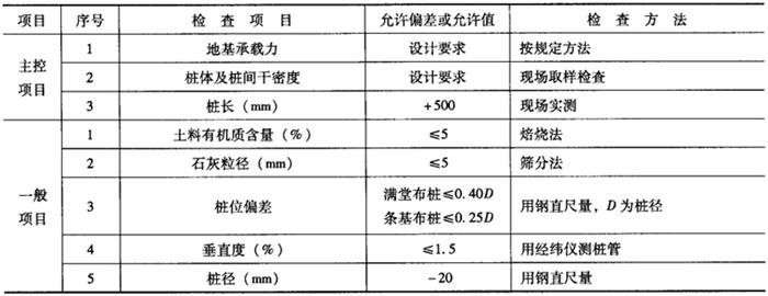 图2-9 灰土桩夯实机的构造示意图(桩直径350mm) 1-机架;2-铸钢夯锤,重45kg;3-卷扬机;4-桩孔 (5)在回填灰土施工时,逐层以量斗定量向孔内下料,并逐层进行夯实。当采用连续夯实机时,则将灰土用铁锹不间断下料,一般每两锹灰土夯两击,以此均匀地向桩孔下料、夯实。桩顶应高出设计标高15cm,挖土时将高出部分铲除。 (6)成孔和回填夯实的施工顺序,宜间隔进行。施工顺序为:先外排后里排,同排内应间隔1~2孔进行;对于大型工程可采取分段施工,以免因振动挤压造成相邻孔缩孔或塌孔。 (7)如果孔底出现饱和软弱土层时,可加大成孔间距,以防止由于振动而造成已打好的桩孔内挤塞;当孔底有地下水流入时,可采用井点降水后再回填填料或向孔内填入一定数量的干砖渣和石灰,经夯实后再分层填入灰土。 (8)在灰土桩施工过程中,应有专人监测成孔及回填夯实的质量并做好施工记录。如发现地基土质与勘察资料不符,并影响成孔或回填夯实时,应立即停止施工,待查明情况或采取有效措施处理后,才能继续施工。 (9)灰土桩在雨季或冬期施工时,为确保施工质量符合设计要求,应采取防雨、防冻措施,防止灰土受雨水淋湿或冻结。 (六)灰土桩的质量检验 (1)为保证灰土桩的施工质量,在施工前应对所用灰土的质量、桩孔放样位置等进行检查;施工中应检查桩孔直径、桩孔深度、夯击次数、填料含水量等;施工结束后,应检验成桩的质量及地基承载力。 (2)灰土桩地基质量检验标准应符合表2-8的规定。 表2-8 灰土挤密桩地基质量检验标准