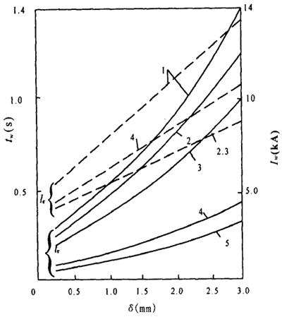 图1-8-3 焊件厚度与焊接电流、焊接时间的关系[2] 1.低、中合金钢 2.特殊高温合金 3.高温合金;4.不锈钢、钛合金 5.铜合金 (3)电极压力 电极压力影响焊件接触电阻、电流密度、电极散热的效果和焊接区的塑性变形。当其他参数不变时,随着电极压力增大,电极-焊件、焊件-焊件接触面积增大,电流密度减小,从而使焊接区加热减弱,散热增强,熔核尺寸减小,强度下降,使强度分散率增大,稳定性下降。 在一般情况下,如果焊机容量足够大,应采用较大的电极压力,以提高焊接质量及其稳定性。但增大电极压力可能引起焊件表面压痕过深,一般采用适当增大电极工作面尺寸以减少压痕深度。焊接低碳钢时,单位面积上的压力在30~120MPa。当规范增强时,选用较大的电极压力;当板厚增大时,应选用较大的电极压力,但由于机械参数的限制,通常,点焊厚大板时,电极压力较小。对某些常温、高温强度较高、线膨胀系数较大,裂纹倾向较严重的金属材料或刚性较大的结构点焊时,为了避免产生焊前飞溅和熔核内部收缩性缺陷,可考虑采用阶形电极压力或马鞍形电极压力。 (4)电极工作面的形状与尺寸 常用电极头有圆锥形和球面形两种。电极端面及电极本体的结构形状、尺寸和冷却条件影响熔核几何尺寸、焊点强度、电流密度、接触面积、散热效果和焊后工件表面质量。随着电极端面直径的增大,接触面积增加、焊接电流密度减小、散热效果变好、熔核直径和熔透率减小。对于电极头为圆锥形的电极,电极体和圆锥角越大,散热效果越好。为了提高焊接质量的稳定性,要求电极直径在焊接过程中的变化应尽可能小。圆锥角一般在90°~140°范围内选取。 3.点焊工艺参数的选择步骤 (1)确定电极的端面形状和尺寸。 (2)初步选定电极压力和焊接时间,再调节焊接电流,以不同的电流焊接试样,直至熔核直径符合要求。 (3)在适当的范围内调节电极压力,焊接时间和电流,进行试样的焊接和检验,直到焊点质量完全符合技术条件所规定的要求为止。 选择工艺参数时,还要充分考虑试样和工件受分流、铁磁性物质以及装配间隙差异方面的影响,适当加以调整。 |