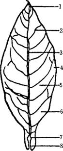 1-叶尖 2-支脉 3-主脉 4-叶缘 5-叶身 6-叶茎 7-叶柄 8-叶耳